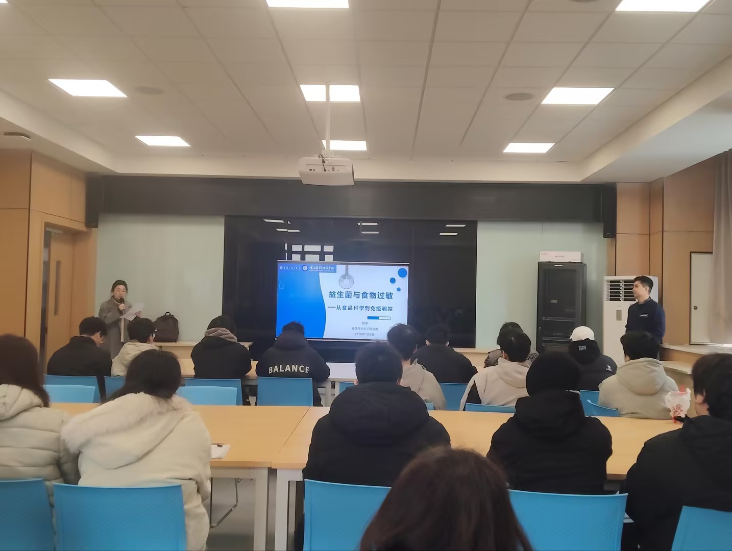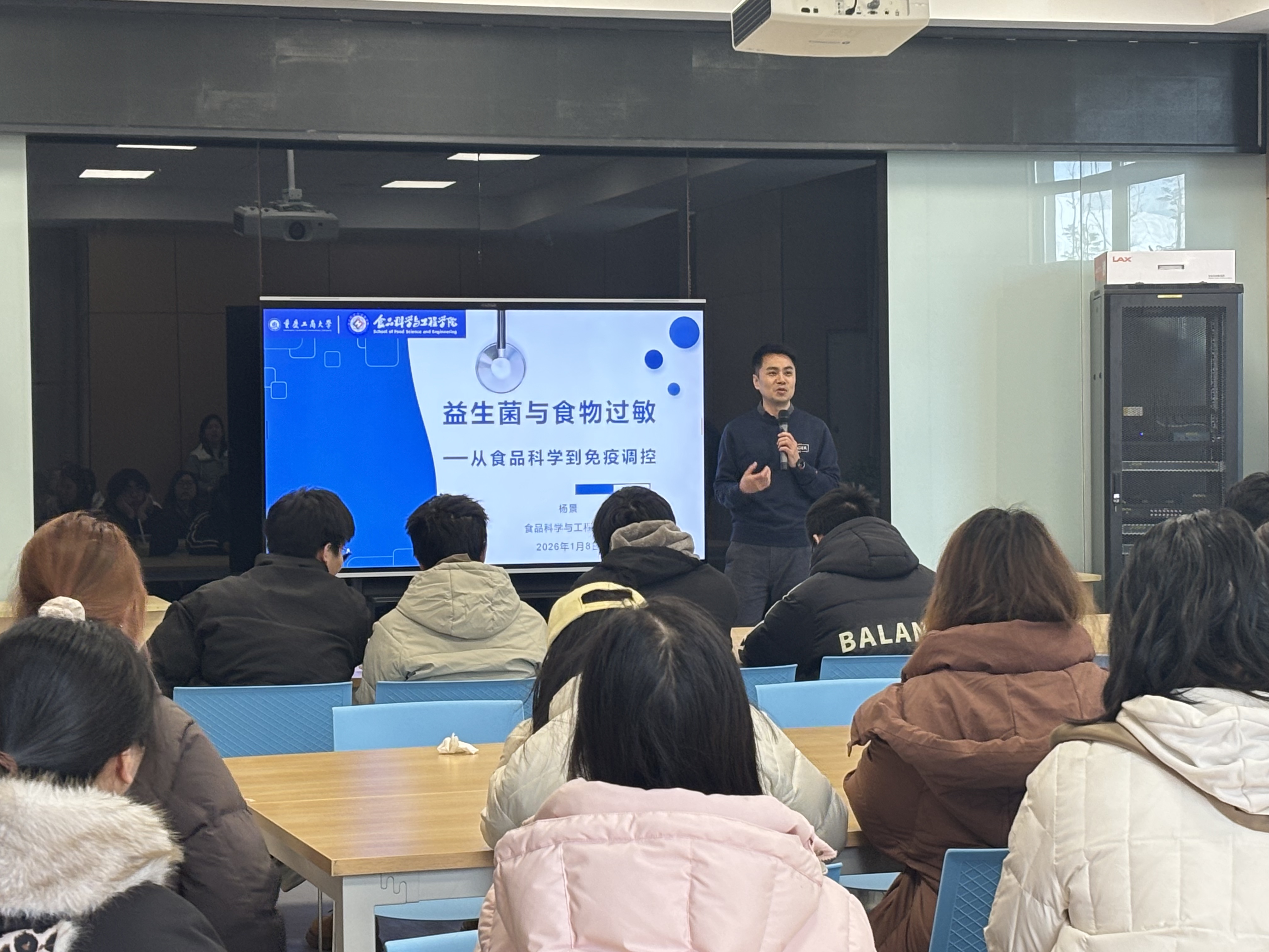 为深化食品科学领域学术交流,增进师生对功能性食品与免疫调控交叉研究领域的了解,2026年1月8日下午14:00,食品科学与工程学院联合茶园励学社区,在钧智楼A201举办以“新‘食’力 新‘行’标”为主题的学术沙龙活动。学院副教授杨景担任主讲人,讲师刘莹担任主持人,带来题为《益生菌与食物过敏——从食品科学到免疫调控》的专题分享。
