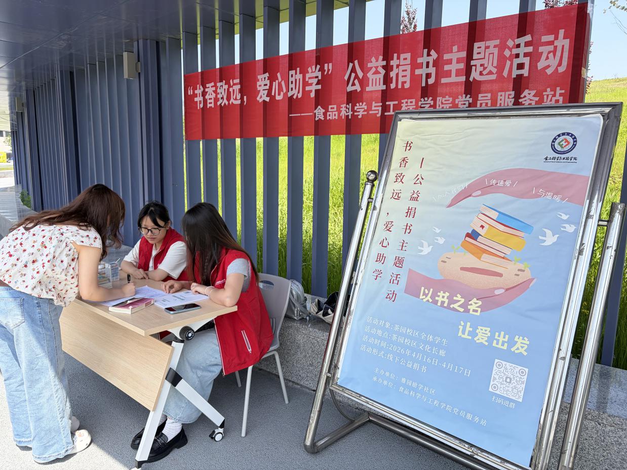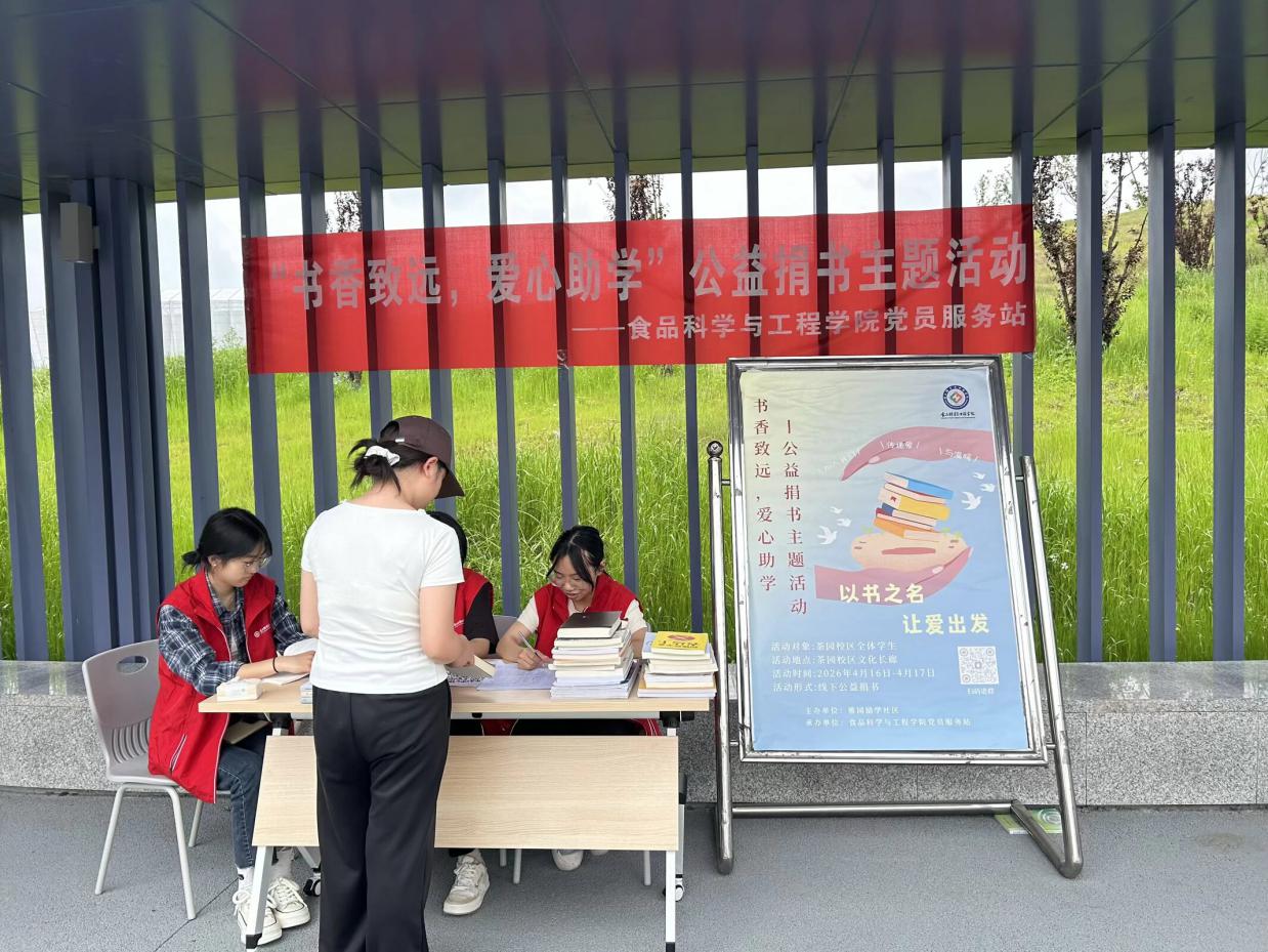 为深化“一站式”学生社区文化育人功能,弘扬互助友爱的校园新风尚,2026年4月16日至17日,由茶园校区雅园励学社区联合食品科学与工程学院党员服务站举办的“一站式”学生社区“书香致远,爱心助学”——公益捐书主题活动在茶园校区文化长廊顺利开展。本次活动依托励学社区平台,搭建起知识传递与爱心联结的桥梁,吸引了全校区师生的广泛关注与积极参与。