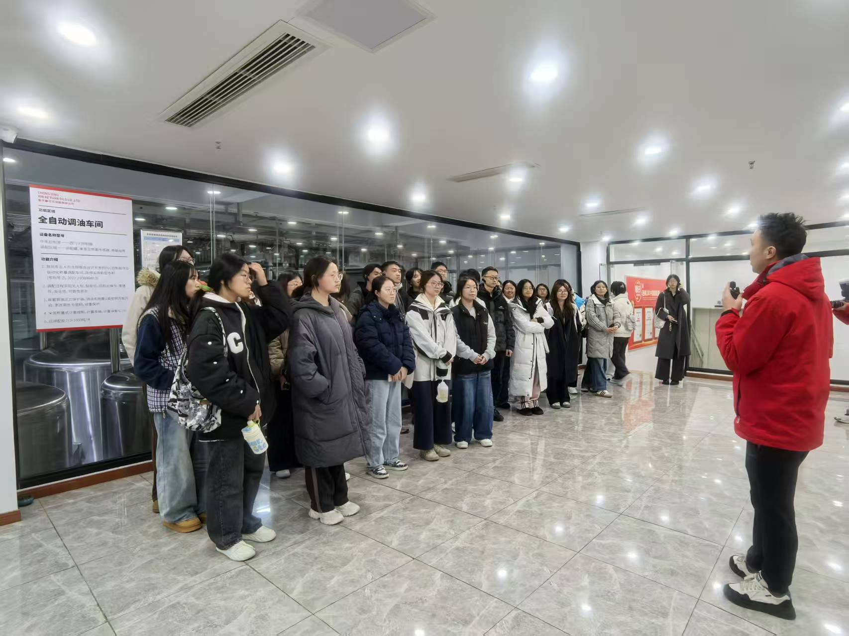 实习首站,同学们来到重庆馨可元油脂有限公司,深入参观了其现代化的火锅油碟生产线。在生产车间,同学们近距离观察了从原料精炼、风味调配到自动化灌装、封装的完整流程,对油脂加工的精密控制与食品质量安全控制有了直观认识。参观结束后,公司研发总监、生产部长、原料厂长等系统讲解了火锅油碟产品的研发理念、工艺创新与质量控制体系,并就行业发展趋势与同学们进行了深入互动,解答了大家在专业学习与职业规划上的困惑。