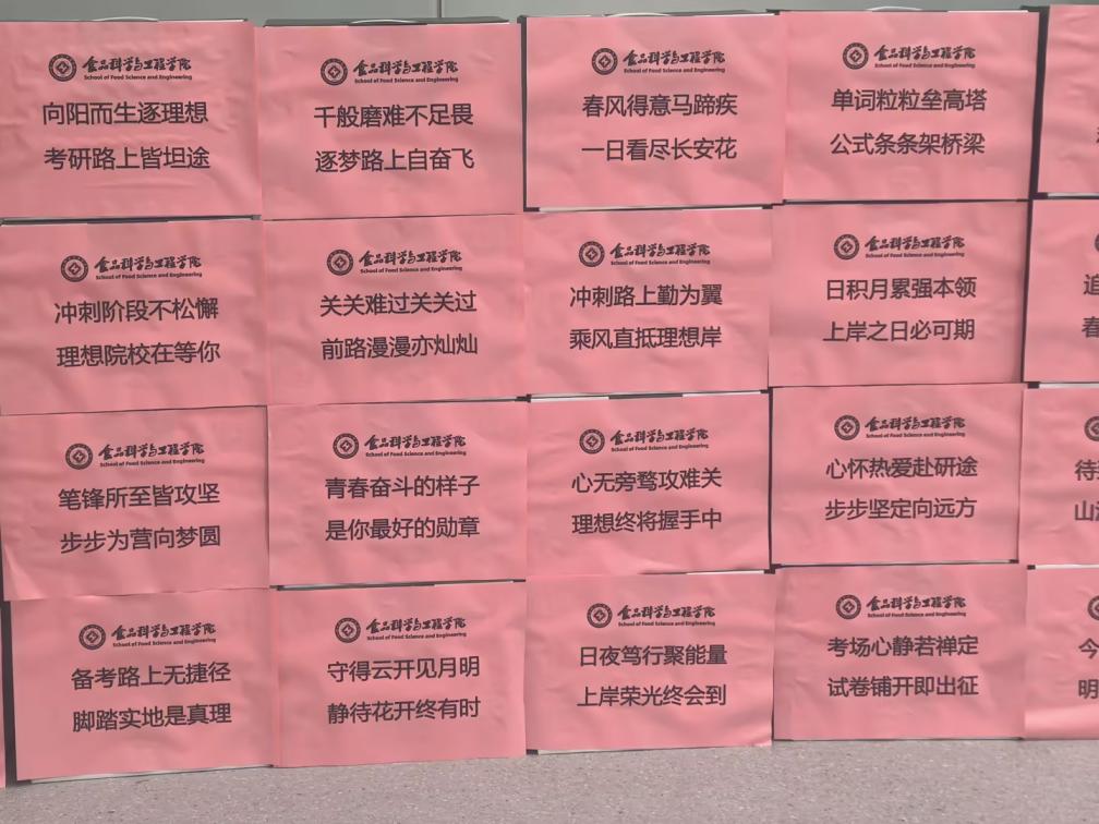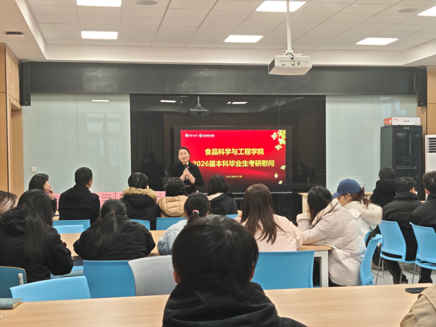 2025年12月17日下午,食品科学与工程学院在钧智楼A201教室举办考研慰问活动,在2026年全国硕士研究生招生考试进入最后倒计时的关键阶段,为正在紧张备战的本科毕业生们送上学院的深切关怀与诚挚鼓励。学院院长王星敏、党委副书记、纪委书记张薇薇、副院长尤琳烽、以及全体辅导员老师共同出席了本次活动。活动现场布置得温馨而励志,营造出积极向上的氛围。